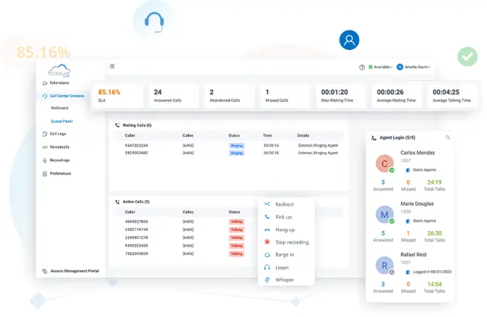 Drag & Drop Call ManagementDrag & Drop Call ManagementVisualized Active & Waiting CallsVisualized Active & Waiting CallsComplete View of Agent StatusComplete View of Agent StatusReal-time Queue Metrics DisplayReal-time Queue Metrics DisplayRole-based Feature Access ControRole-based Feature Access Control